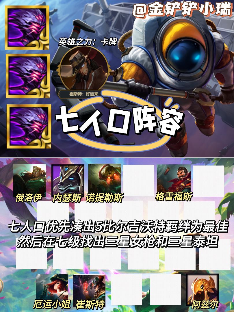 第二个海克开始最好拿战力相关的,因为这样加成下女枪输出会非常爆炸。有比尔司令转职也可以拿,这样提升阵容上限,可以替换下低费卡提升强度。5人口继续有啥上啥,快速存钱升级人口即可。6人口,如果血量掉的快可以小d找下前排两星,然后存钱上7.3-4选秀:选秀依旧日常拿阵容卡,然后再考虑装备