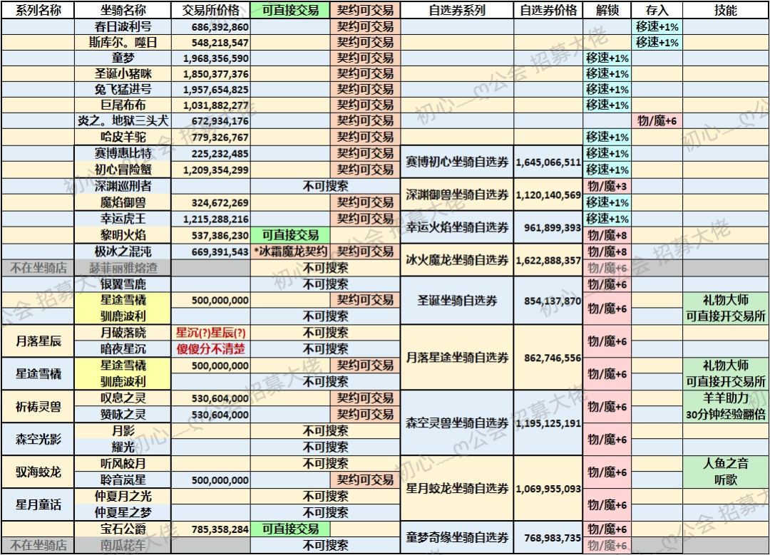 附上预览图,整理成表格,显示正式服交易所的坐骑契约单价,自选券的单价,是否能直接交易或是只能交易契约,存入/解锁/技能等等。