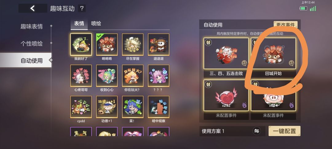 玩家也可以自定义自动使用,比如针对回城开始就可以配置一个表情,这样就能做到嘲讽了。