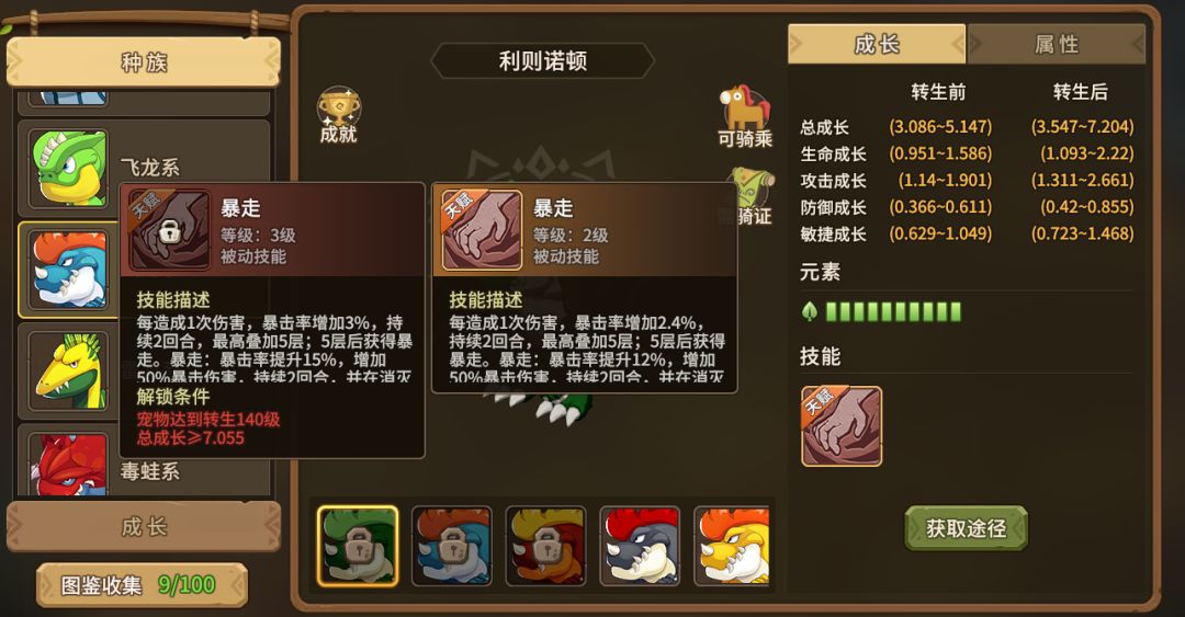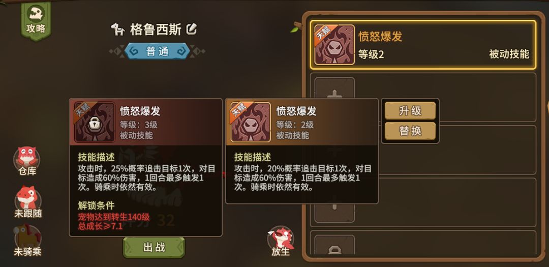 (1)暴龙(威慑)对生命80%以上敌人额外造成伤害;人龙(暴走)多次攻击叠加暴击率被动,激发暴走特效,增加暴击伤害;老虎(愤怒)攻击时,20%概率追击目标1次,对目标造成60%伤害。暴龙,人龙和老虎主打极限输出。