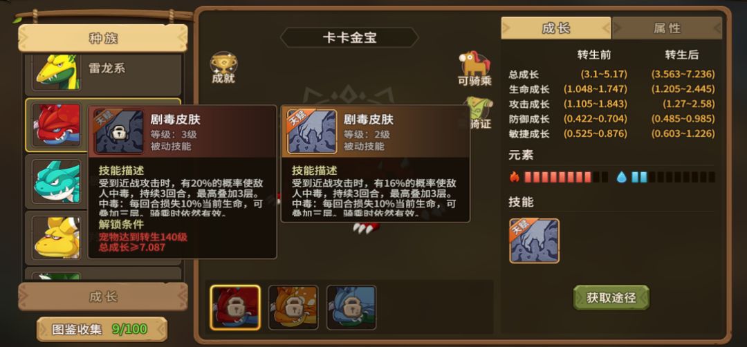 雷龙,硬化皮肤天赋可以提高生存能力,毒蛙,剧毒皮肤天赋会使攻击者有概率中毒,穿山甲,石化皮肤天赋会使攻击者有概率石化,而飞龙是高敏宠物,每回合开始如果触发飞行天赋,自动清除自身所有控制状态,保障医生的正常出手。