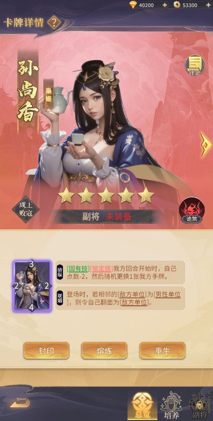 「孙尚香」是一张属于诡煞阵营第三环境天下兴亡的紫色品质英雄卡,有着枭姫之称。当解锁2星技能【骄纵】登场后,若有相邻男性敌军,宁死不受辱,立刻翻面成为敌方友军。解锁技能2【联姻】我方回合开始时,进行自损点数-2,我方随机更换一张手牌,导致打乱节奏,果然女人很善变,使用好的时机很重要呀,兄弟们,或许胜败与否就看她了。