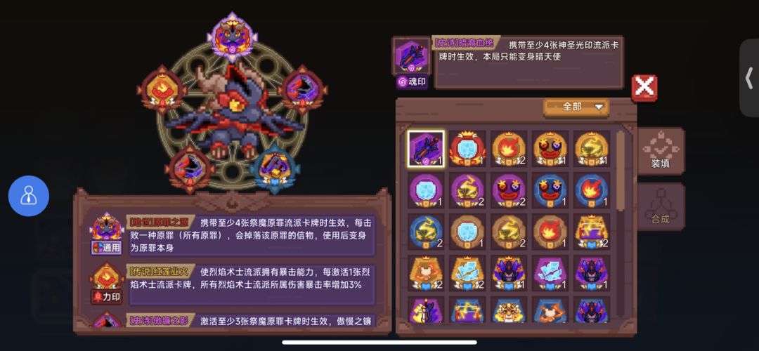 3.卡组:直接看图就行,之前我试过第一张卡是色欲,第一波怪就直接变身,但是用久之后还是发现冷水舒服,锤1本身叠罪业的速度就很快,配合宠物的罪业恩赐,也只是晚一两波怪变身而已,趁早激活傲镰和蛇心更重要,随后就是稳定收罪业了,到了图1有柱子首领房也完全能叠到傲慢,可以直接站撸几乎能秒,可以看我放的图,图1首领房就傲慢了,前提是图1得走有魂的关卡(奖励是魂或者有怪的关卡)