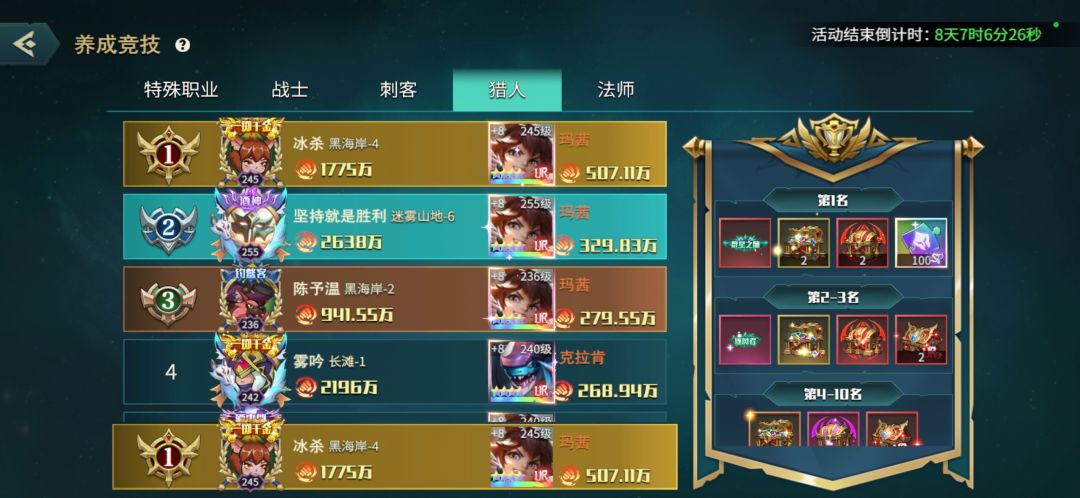 三、猎人升阶,升星,装备,神器,专属等,有资源就升,需要注意的,装备精练每加10是质变,建议主C加20后,副C加10,资源重点在主C,这里有一个氪金点,就是专属升级,白嫖的一般只能拍卖买符文到+10,要+20和+30需要金叶就是氪金点买,每周买一次50个。像我氪金近5000,现在才主C下周才能专属加30,不然靠每天打龙掉的那一个,20升30要250个真理宝珠,自己算时间。神器:加6质变,每个8000钻,打龙最少要一个月才能换到一个。
