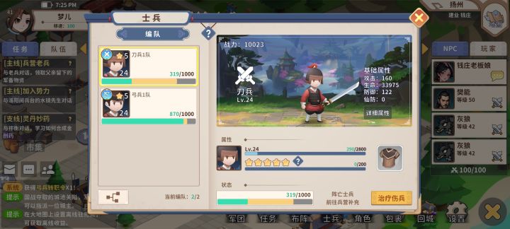 首先士兵的补充分为两种形式,一是伤兵的治疗,一是阵亡士兵的补充。受伤的士兵,使用一个金创药就可以全部恢复健康,但阵亡的士兵则需要消耗义勇兵和布甲来补充。