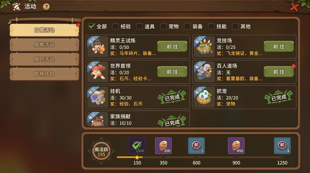 在《石器时代:觉醒》中拥有非常多的玩法,除了一些日常的玩法,需要各位玩家自由探索之外,每天5点更新的精灵王试炼、每周一5点更新的元素神殿、每周一5点更新的勇闯天空岛,全天可参与每周结算2次,每周三、周日21:00-22:00开启的尼斯大擂台和挂机都可以与其他玩家组队进行参与。