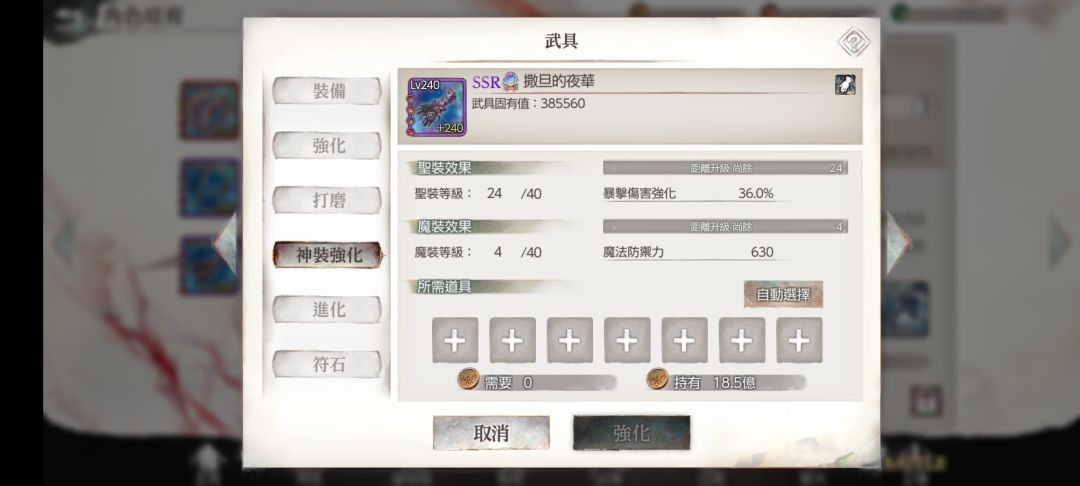 通过穿透速度,你顺利地使用连点器通关,然后你发现了一个新功能,就是魔装和圣装强化。