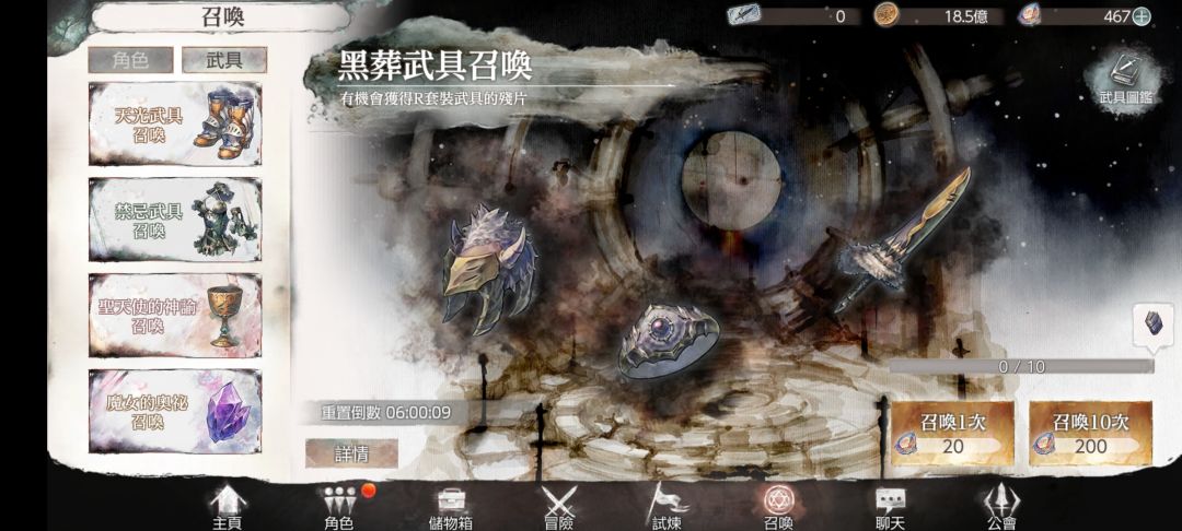 5.后期装备卡池于通关13-22后开启(应该没记错),一般建议抽一套紫色的(图8禁忌武具栏),然后慢慢抽红色的(圣天使的神谕栏),圣天使召唤每天有一次免费抽取,然后星期一重置,而兑换道具需要第十次才有五分之一概率出(可以花三万石头保底),所以星期天的时候花900石头补一下就行了,慢慢凑一件就可以了。我没有圣天使的武具也打到21-6了,所以不是必须的。
