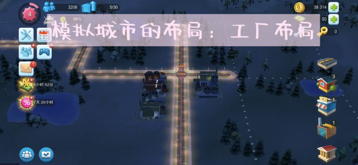 该城市布局为人口较少的布局之一,该城市布局都有3个一模一样的小型工厂,这都是因为当前城市的等级很低,无法建造更多与众不同的工厂。等到我下次再玩该游戏时,我就能建造更多更多的工厂来生产材料了。