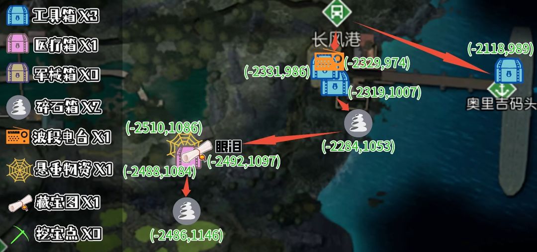 奥里吉岛的探索点相比其他地图不是很多。主要是藏宝图/宝箱/波段电台/悬垂物资。没拿满探索的兄弟可以参考图片坐标