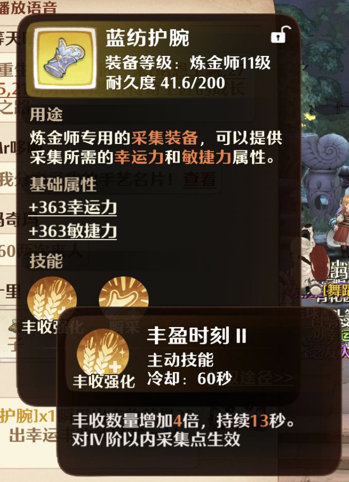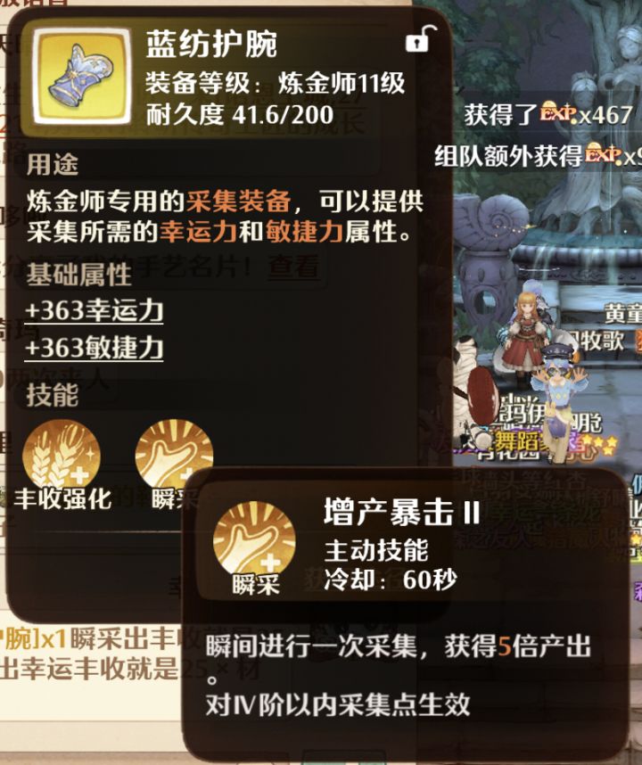 下面说说护腕上的幸运瞬采,他是没有倍率的,你采集的时候点一下幸运瞬采他顶多就是abcd四个材料,如果你点幸运瞬采出现丰收,那么你最多就得到abcd×2每个材料各两个,也就是说你精华得到手就是两个,这样解释能不能理解?