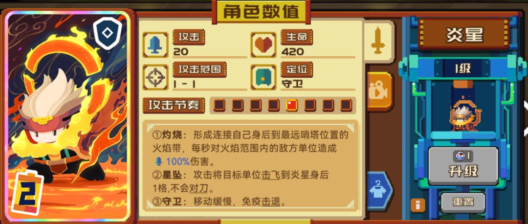 后撤步加上较早的攻击节奏,击剑手可以白嫖绝大多数的近战角色,还能克制新的传奇卡炎星,在单防的情况下有很好的发挥。但后撤步需要一格的空间,如果位置被挤占了,核心技能就失效了。并且就算触发了决斗,本身身板依旧不算硬,如果对方有跟远程兵也会很容易被解决掉,后撤步只有一格也会害怕枪士或近卫这种两格范围的近战兵种。由于后撤步躲避攻击,塔下防御的时候是没办法保护哨塔的。