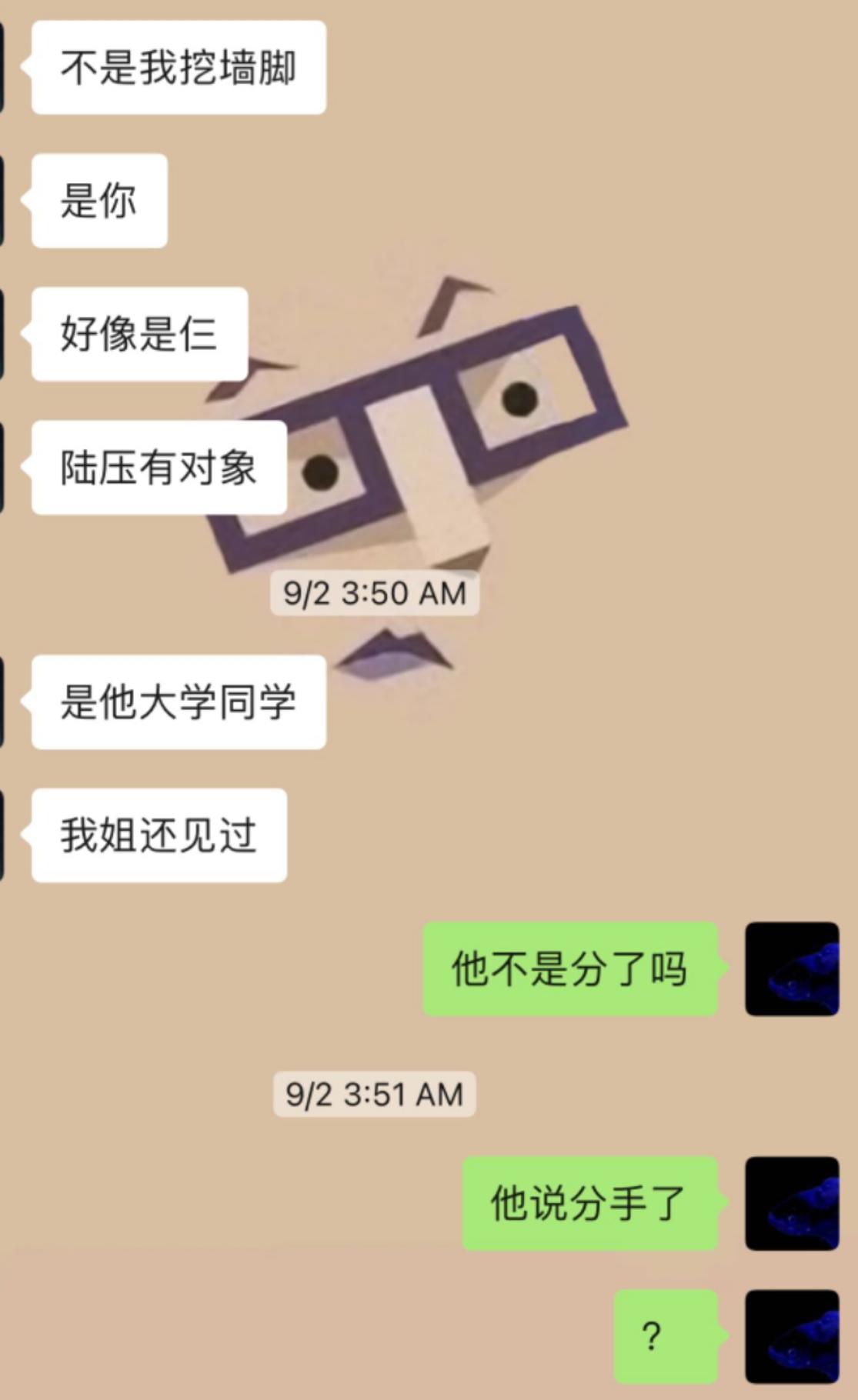 在压压和a谈的期间,我就发现了不对劲,因为在压压和我在的一个小群,曾经压压说过了一个关于自己大学白月光的事并po上了合照,我不是脸盲,有一次压压在群里发了个和女生出去玩的照片,还有一次压压手滑发了个女生的几张自拍照,我认出来了这个女生就是曾经的白月光,因为能手滑发出去,肯定是新存的,谁懂啊家人们明明自己有对象了还老和大学白月光去玩还继续存人家照片,但是一开始我因为各种原因很忙不想牵扯太多,就一直忘记和a谈这件事,然后因为压压和这个小群其他几个我认识的我家族的管理相谈甚欢我怕我之后告密会被扯进去,然后大家都不好做人。