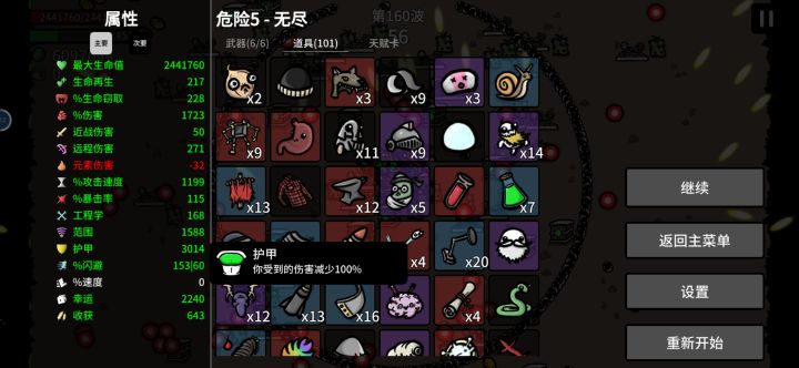 经过160关的磨炼,护甲叠到了3000+,200多w的血量,词条已经显示减少100%伤害。