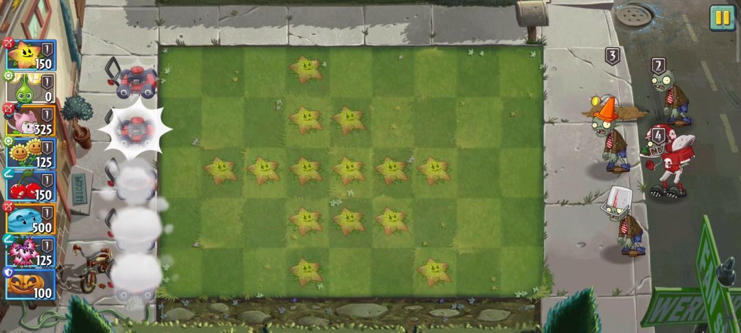 主要注意产光任务,在能保证阳光产量的情况下再放星星果,用南瓜头阻挡冲锋的橄榄僵尸
