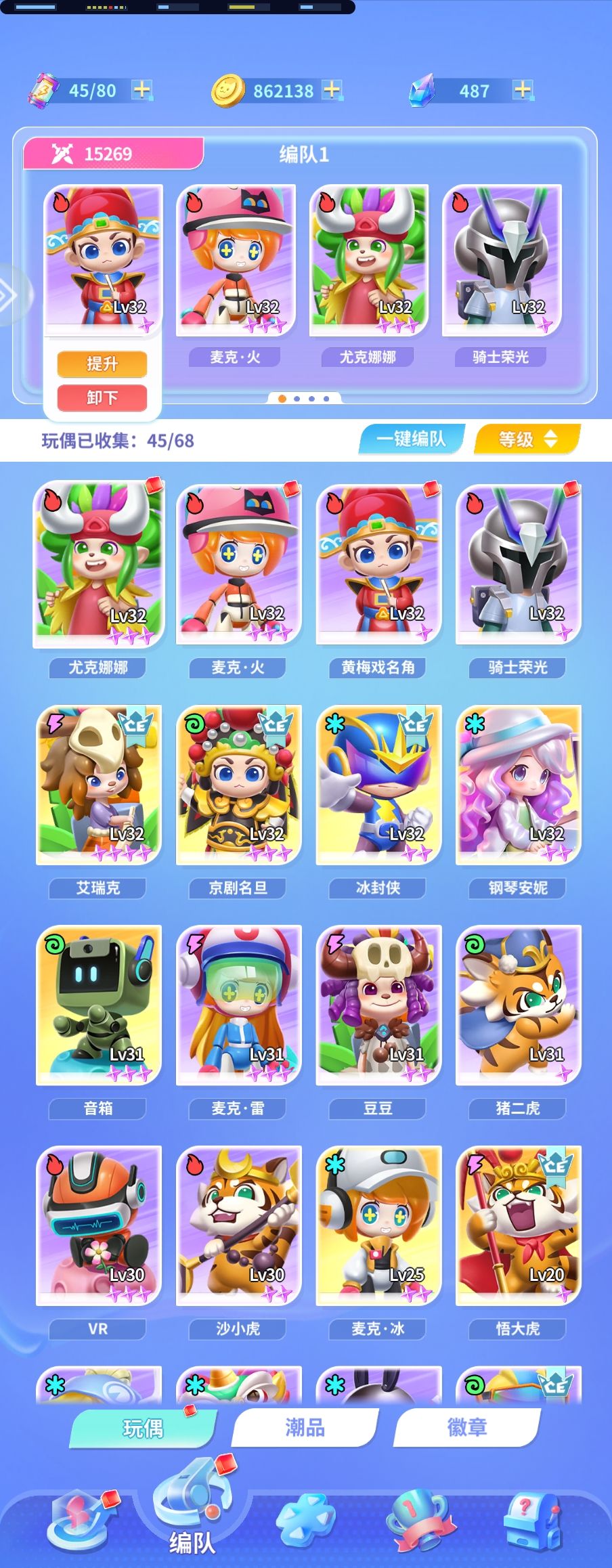 发现这里卡关的萌新也很多,作为白嫖/低氪玩家之友的我又来做个简单的讲解,其实这关本质还是个机制关,别老想着莽,及时调整阵容,利用好机制过关还是很简单的,可以在下图中看出我的这些角色只拉了等级,洗练一点都没洗,特性用的是系统的一键装配,也全是一级特性,玩偶的数值都不是很高,甚至连萌新最爱的艾瑞克都不需要,根据局内的效果我们组出带武器的纯火队,潮品也尽量带上能生成武器的,依靠武器叠高buff后几下将boss带走