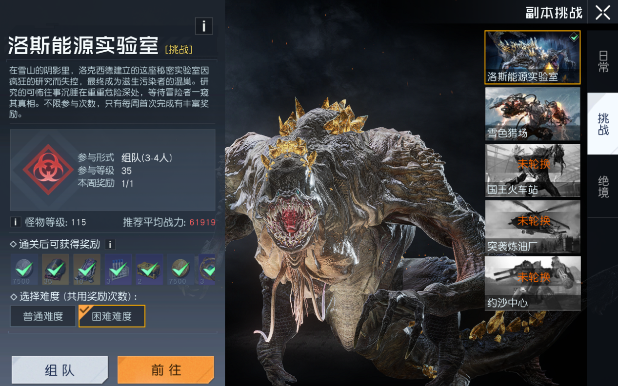 洛斯能源实验室为115级挑战团本,本次挑战支持难度选择,鸦鸦推荐普通难度更适合新手幸存者,困难难度比较适合老练的幸存者。前往挑战需要组成3-4人队伍,成功击败首领可以获得丰厚报酬,都是生存路上的必备物资!