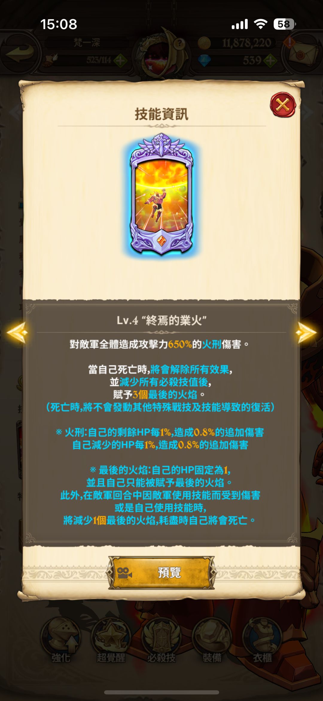 根据必杀技等级不同,所赋予的“最后的火焰”数量不同:1级必杀,1个火焰;2级,2个火焰;4级,3个火焰;6级,4个火焰。