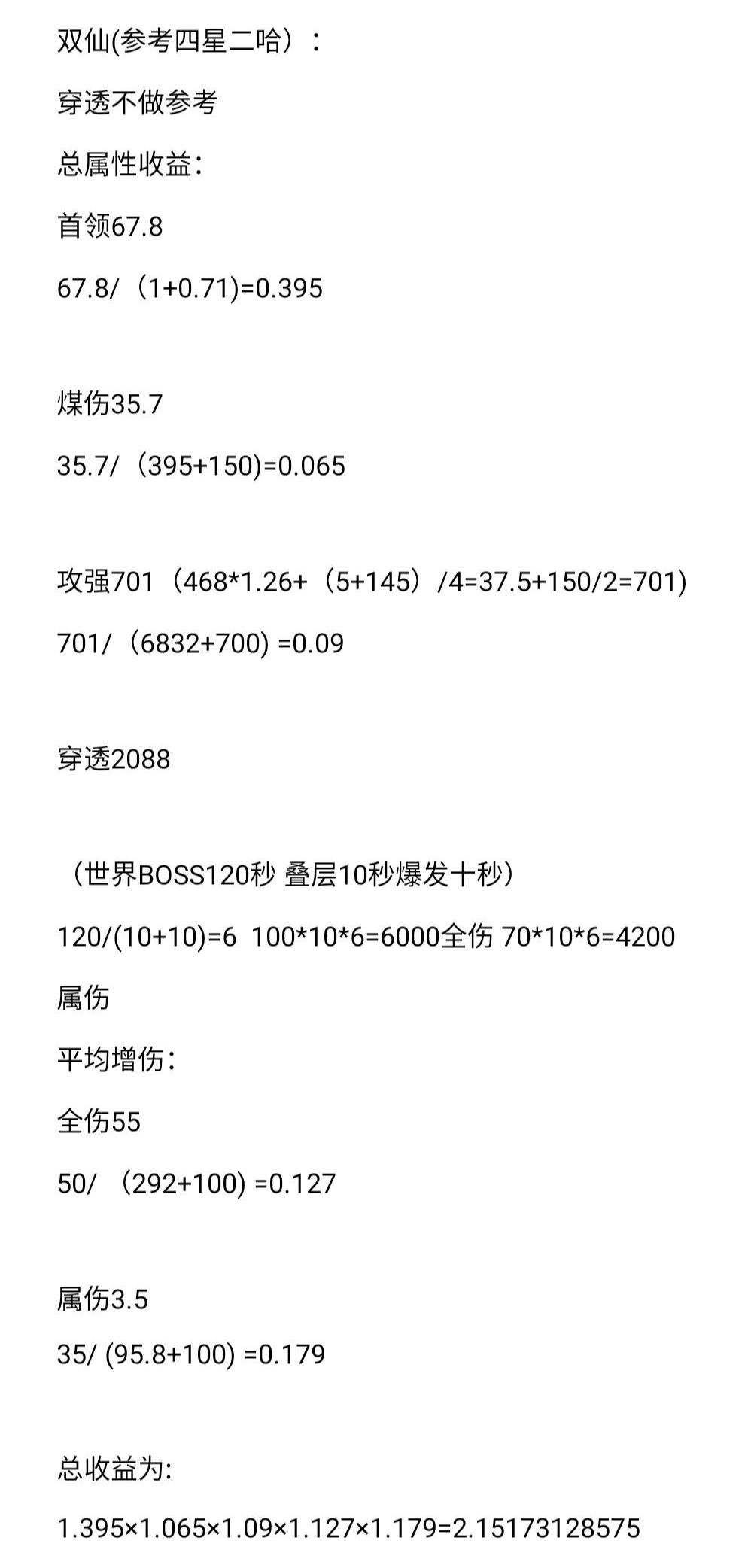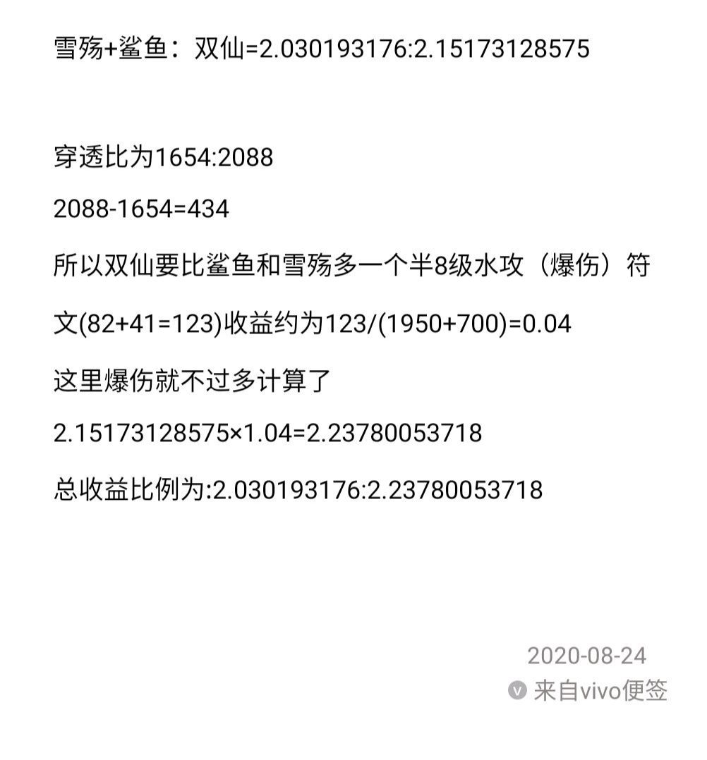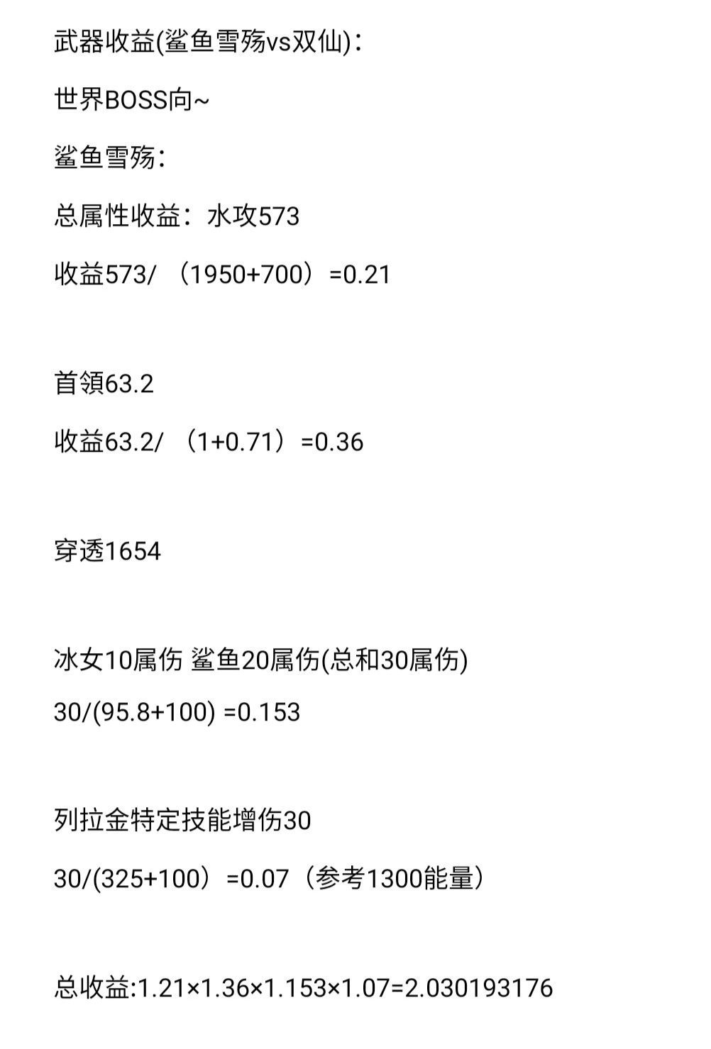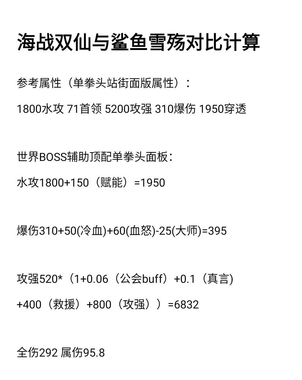 由上图简单计算可知双仙王对比鲨鱼+雪殇提升是有的,大约百分之十。这里说一下练度低的不建议做双仙可以做单仙,雪殇换成法杖,至于为什么不是吞天剑。可以自己简单计算两者收益。