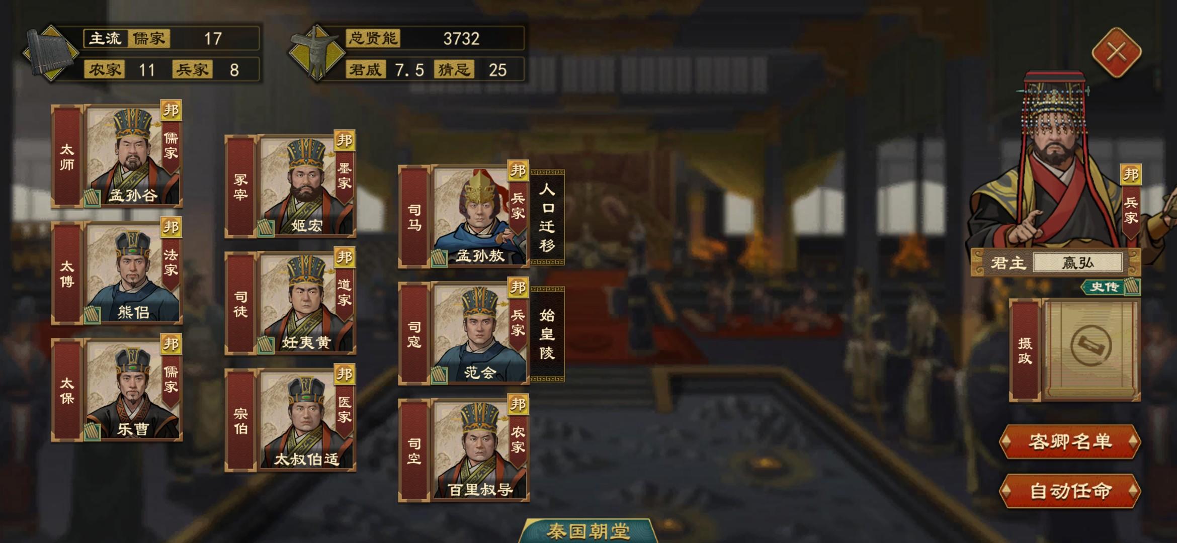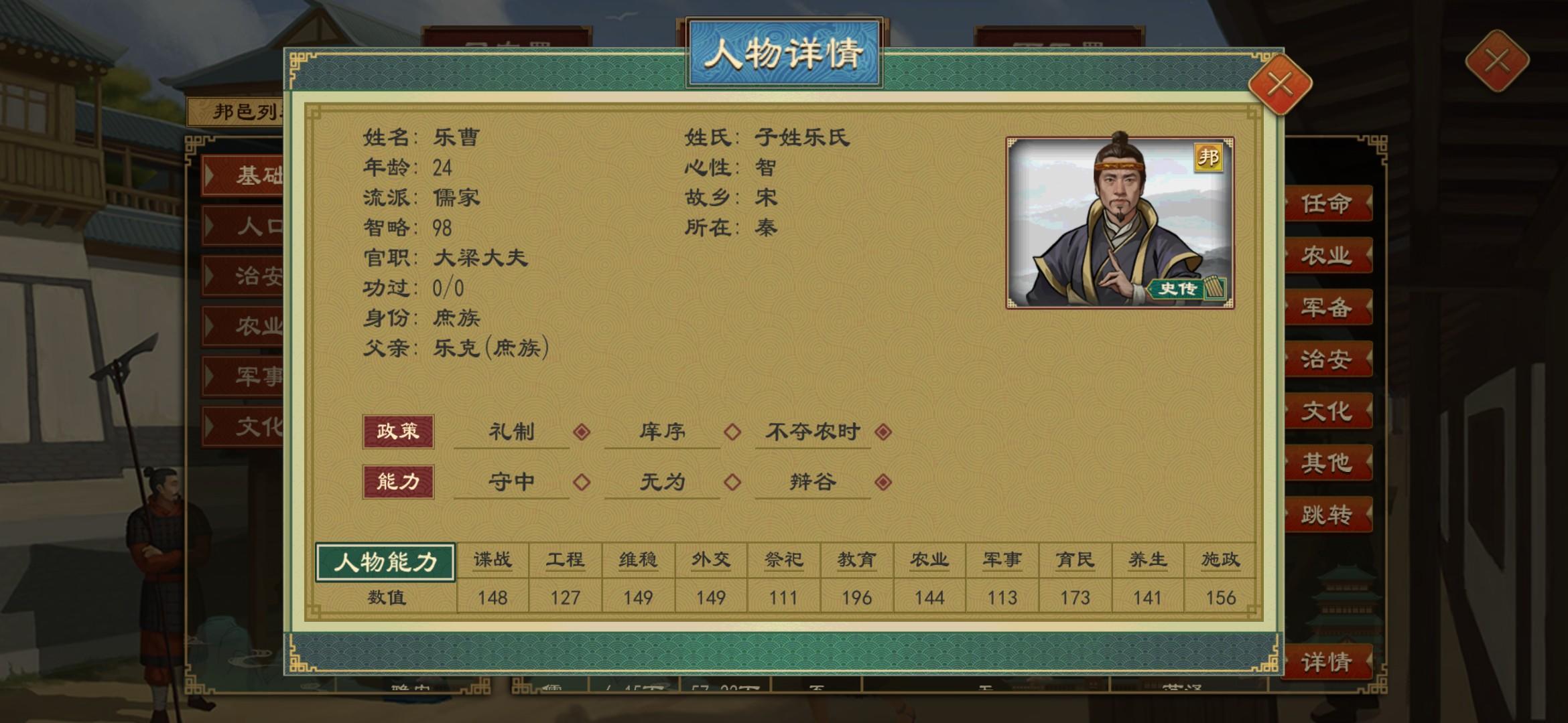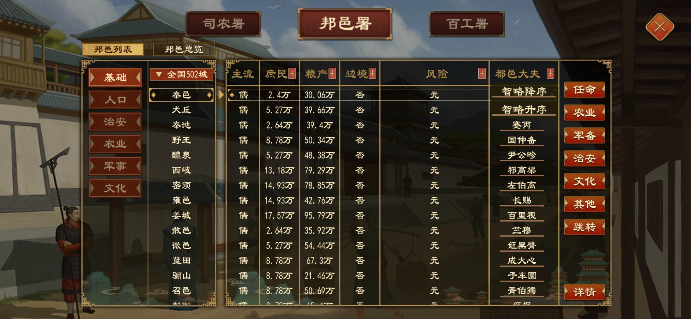 。然后我们就可以上:计府的-邦邑署-都邑大夫-智略降序,第一个就是智略最高的高质量人才,以此类推。自从学会了这个方法,帮我找出了很多稀缺人才。这个方法也适用于找各国的高质量美人,可以改善下一代国君的基因和智略