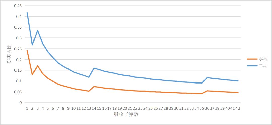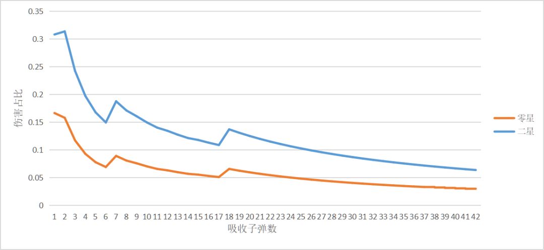 可以发现在吸收数量十几的时候震慑波的伤害占比就很低了,二星在低子弹数的时候提升较大,但由于冲击波龙本身不适合少子弹情况,震慑波的清杂能力有限,致使总体上震慑波发挥的作用有限。