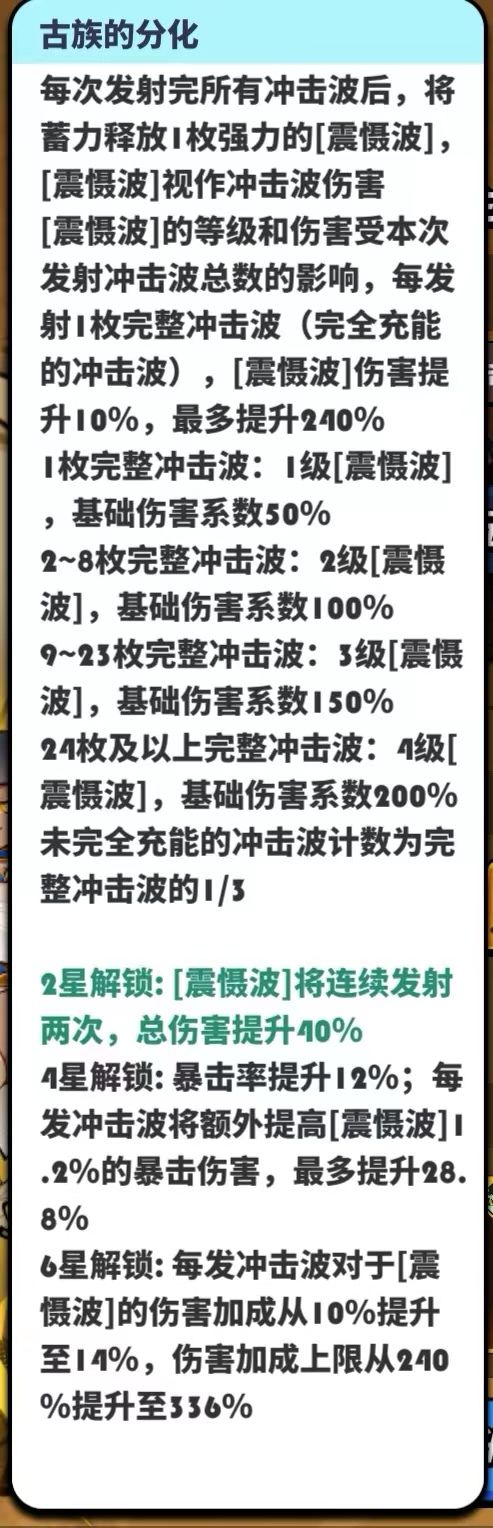 这是核心天赋震慑波的描述,视作冲击波伤害,设计的意图是发出的冲击波数量越多,基础倍率和加伤越高,但是由于基础倍率不高(假设上一篇的结论正确),实际上并没有占伤害的大头,这同样使得克莉奥的星级设计出现了问题。