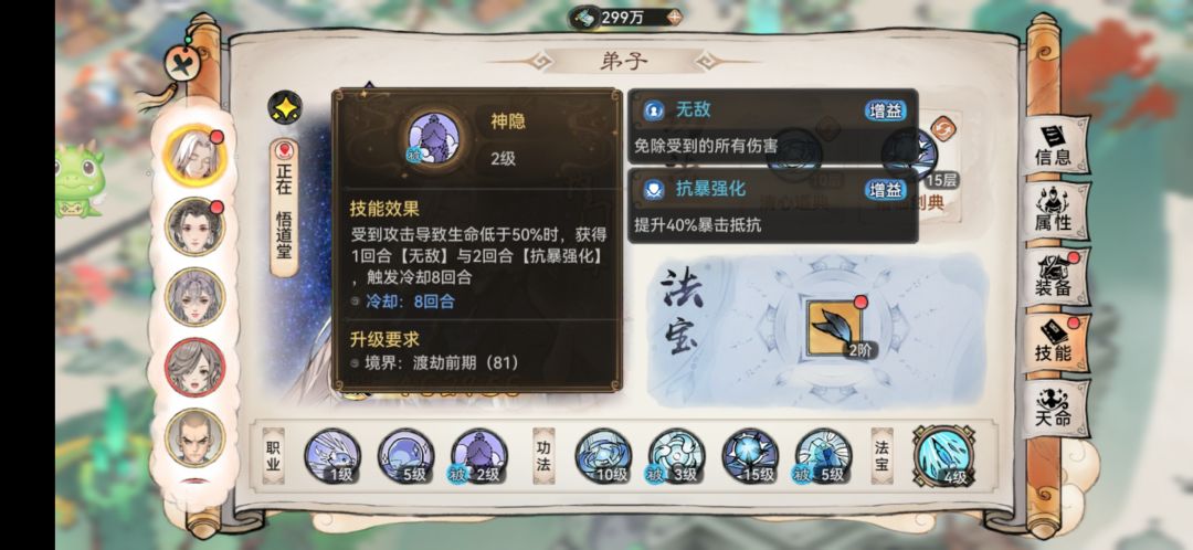神隐受到攻击导致生命低于50%时,获得1回合[无敌] 与2回合[抗暴强化]触发冷却8回合