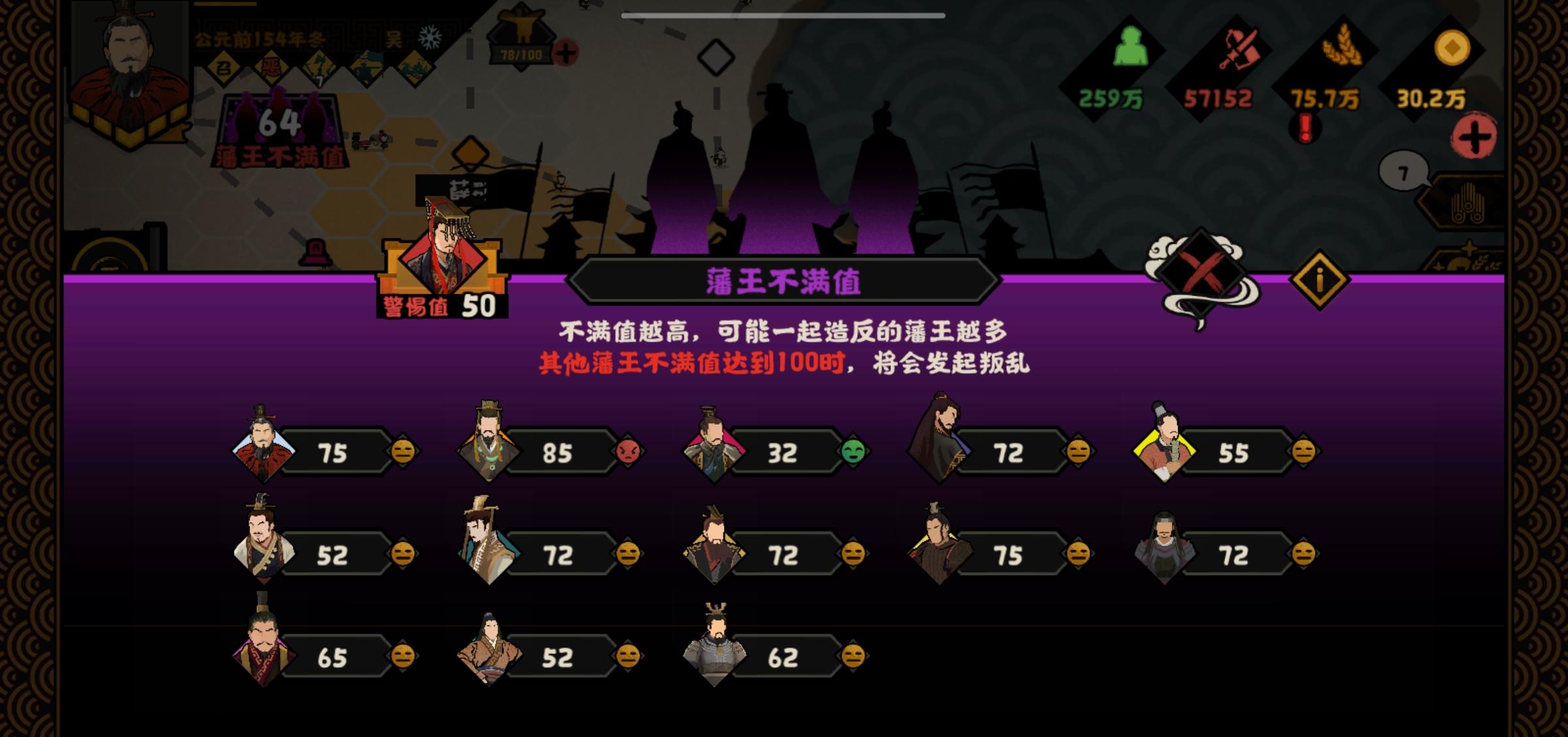 注:这套打法主要依靠会盟压藩王的不满值,从而在掀起叛乱时保证吴王所需的队友