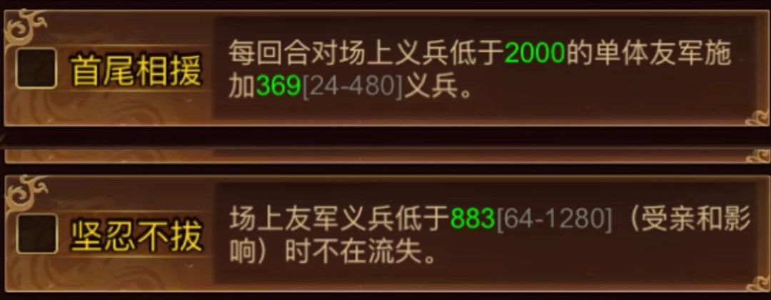 1.首尾相援(稀有):每回合随机对单个友军加xxx义兵
