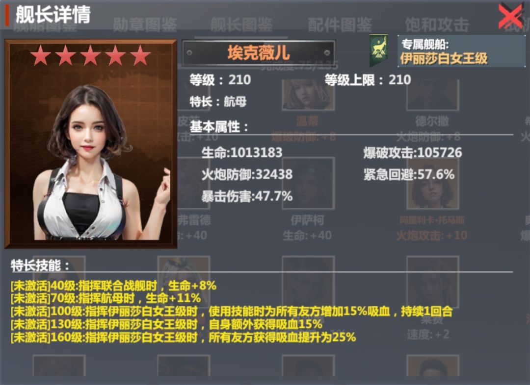 简评:伊丽莎白女王级自带吸血,每次满血都会提高攻击并获得护盾,同时拥有不俗伤害;上阵舰长后能为全队提供吸血,大幅提高续航能力。新手期就能获得而且好升星,是前期最推荐的船只之一!