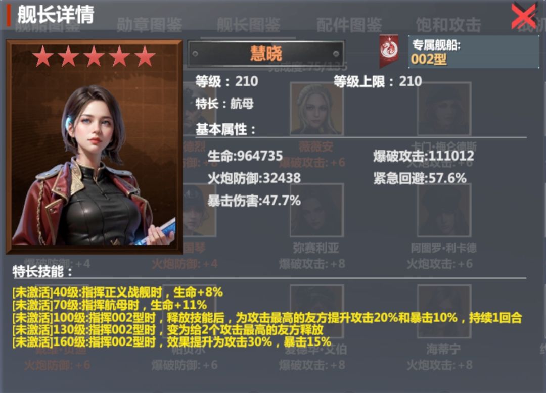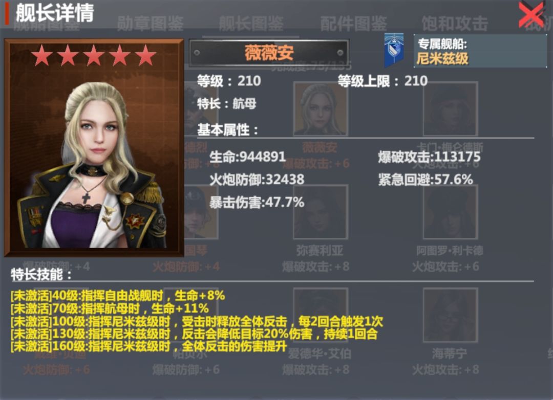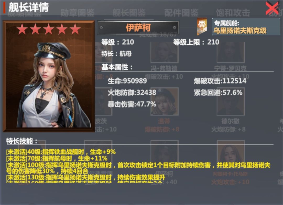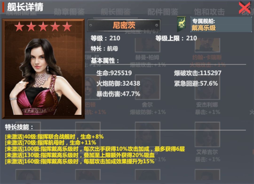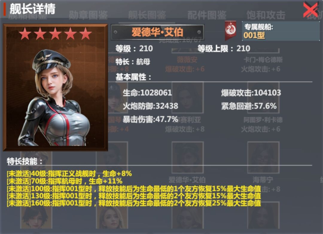 简评:戴高乐级普攻降低敌人爆破防御,技能提高自己免伤,被动清除异常;上阵舰长后,可以获得攻击加成和20%吸血,各方面都有涉及但是没有突出点,只适用于新手前期。