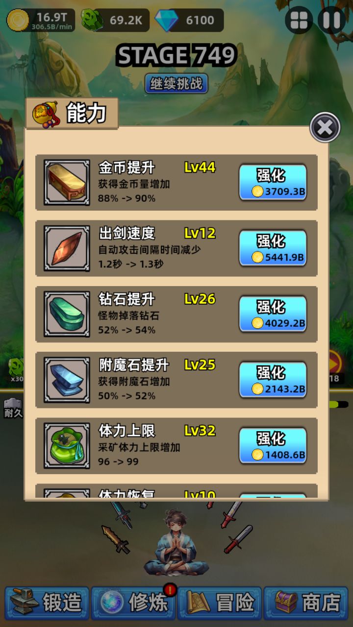 刚开始玩确实剑数量越少打的越快出剑要要时间的界面中间右边广告看下可以加快出剑速度buff,能力金币加成离线加成优先点,玩一段时间所有能力可以点就点都有用,剑灵剑宠攻略有很多就不说了。