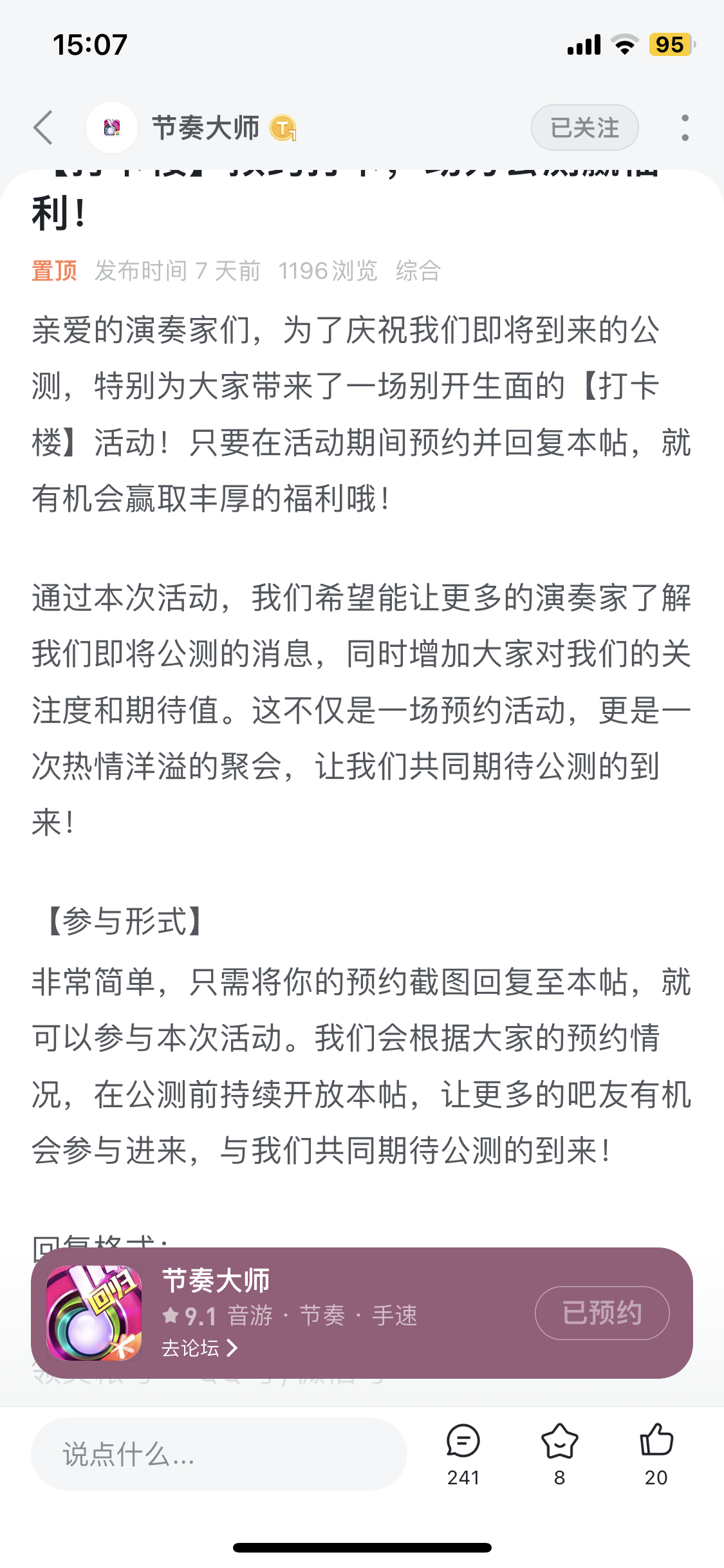 亲爱的演奏家们,为了庆祝我们即将到来的公测,特别为大家带来了一场别开生面的【打卡楼】活动!只要在活动期间预约并回复本帖,就有机会赢取丰厚的福利哦!通过本次活动,我们希望能让更多的演奏家了解我们即将公测的消息,同时增加大家对我们的关注度和期待值。这不仅是一场预约活动,更是一次热情洋溢的聚会,让我们共同期待公测的到来!【参与形式】非常简单,只需将你的预约截图回复至本帖,就可以参与本次活动。我们会