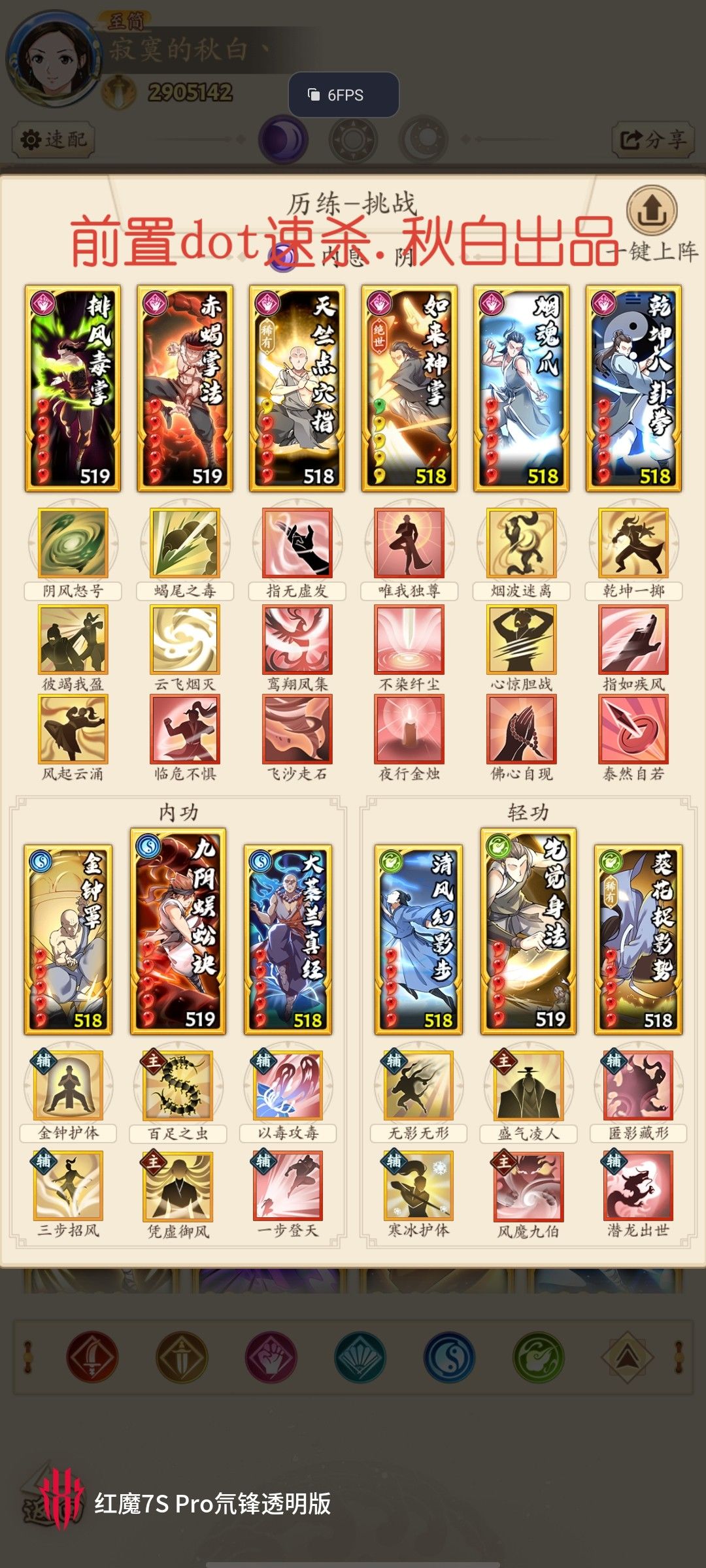 注解:很常规的一套阴拳,核心输出点在赤蝎夺魂如来这三个武学