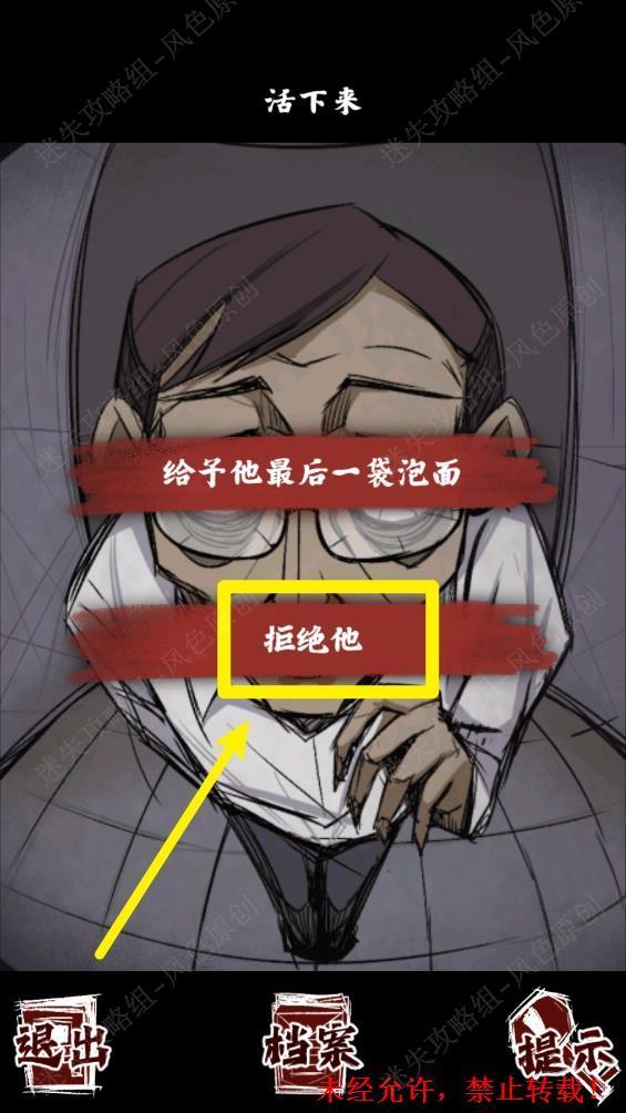 70.结局2【善意】:在男人第一次敲门时,选择【给予他最后一袋泡面】。 70