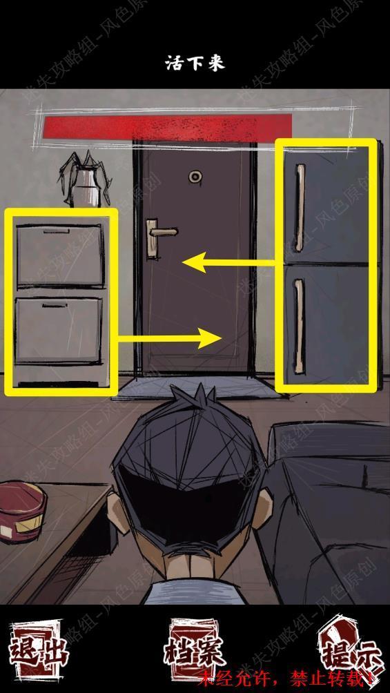 64.在时间耗尽前,将冰箱和柜子移到门前挡住门。 64