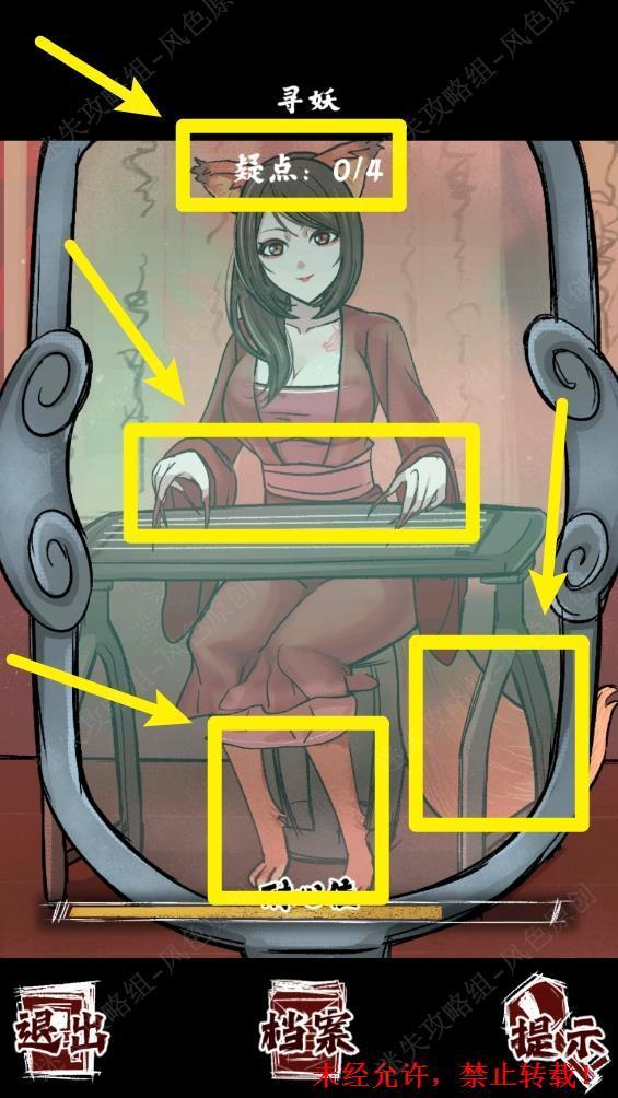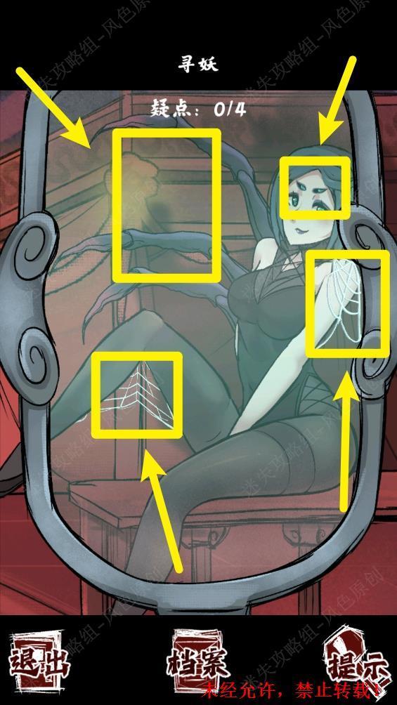 111.使用【照妖镜】查看黑衣女子。疑点:蜘蛛腿,肩膀上的蛛网,头上的蜘蛛眼,左腿的蛛网(后两个疑点需要分别向上划动头发和向左划动腿部)。 111
