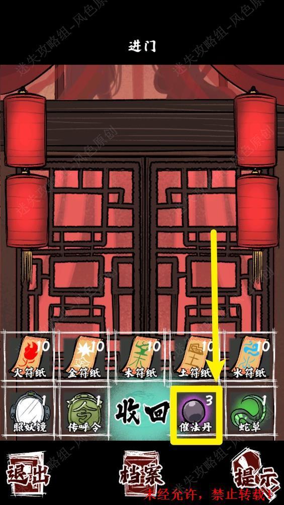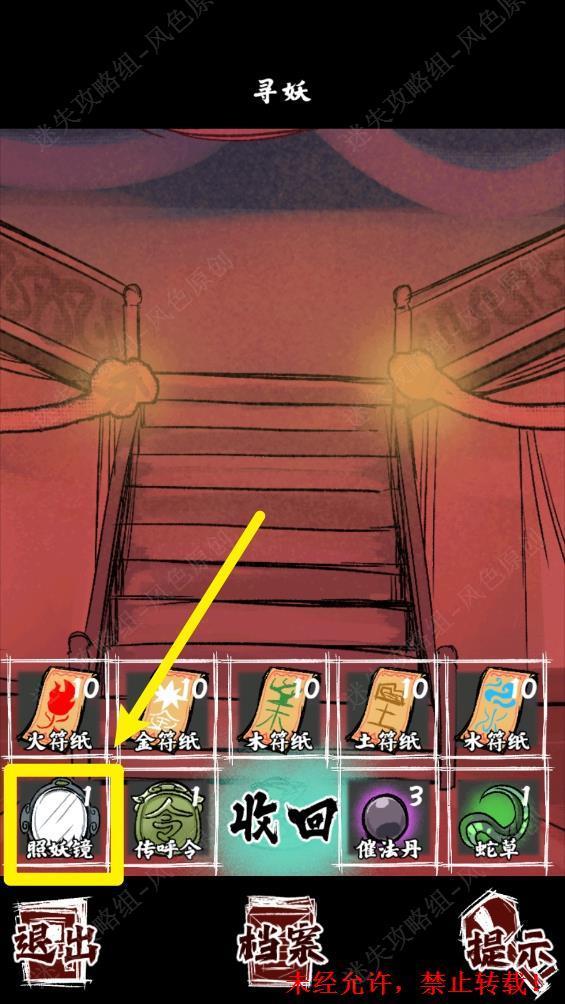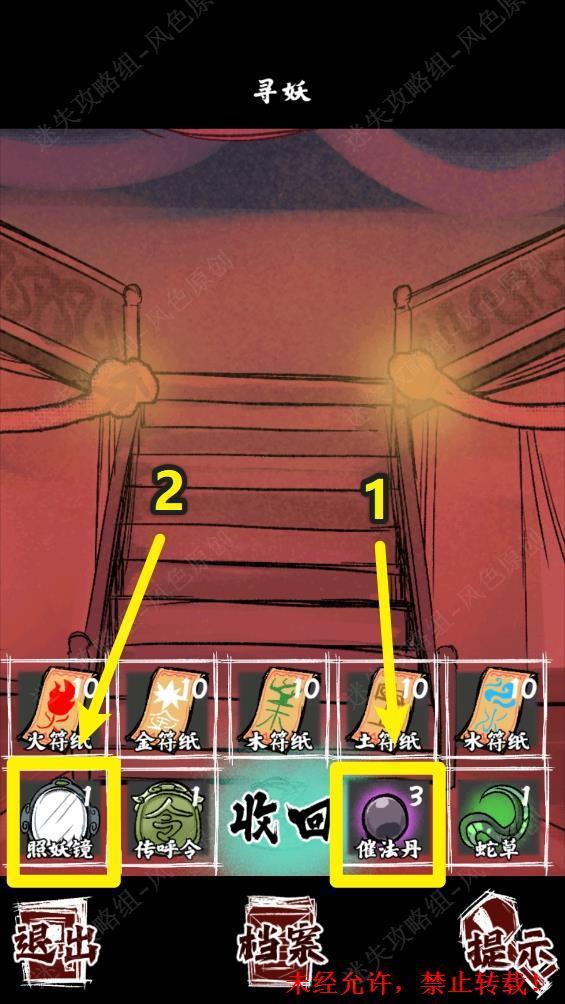 109.结局2【捣魔窟】:与白衣女子对话结束后,先吃下全部三颗【催法丹】,再使用【照妖镜】。 109