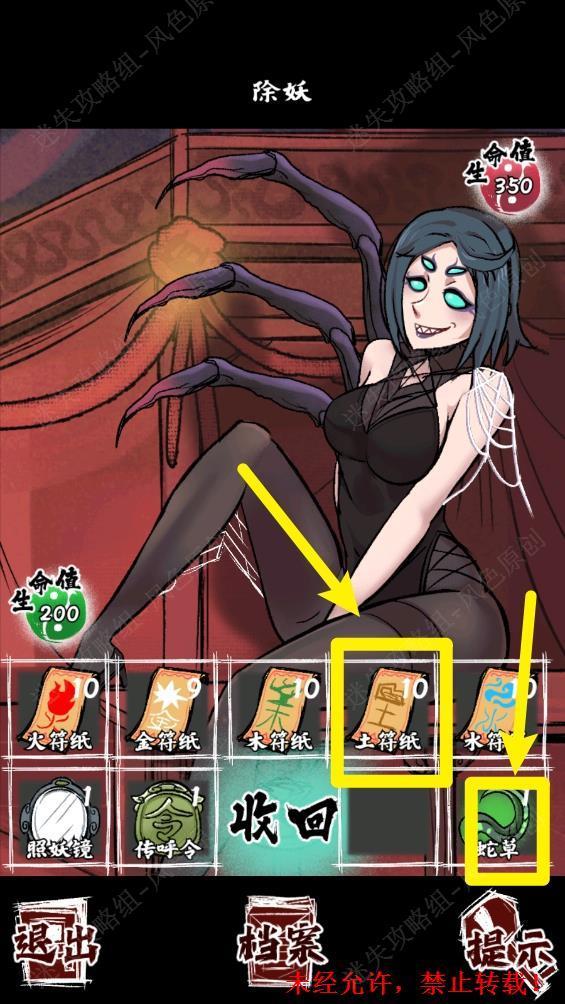 112.进入战斗,蜘蛛精为黑色,属水,用【土符咒】克制,血量低时注意使用【蛇草】回血,打败蜘蛛精后,点击其尸体。 112 112.1