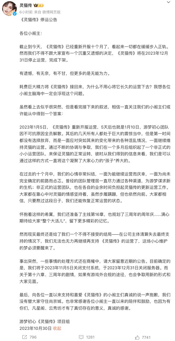 项目组表示,游戏重新开服5天后,团队便因不可抗力解散,开发人员自行组建一个小团队,在业余时间负担起游戏的更新运营工作,但树目前公司主题已经破产清算并失去最终支持,团队已无力再支持《灵猫传》的后续运营,游戏最终确定将于12月31日停服,11月5日关闭支付系统。