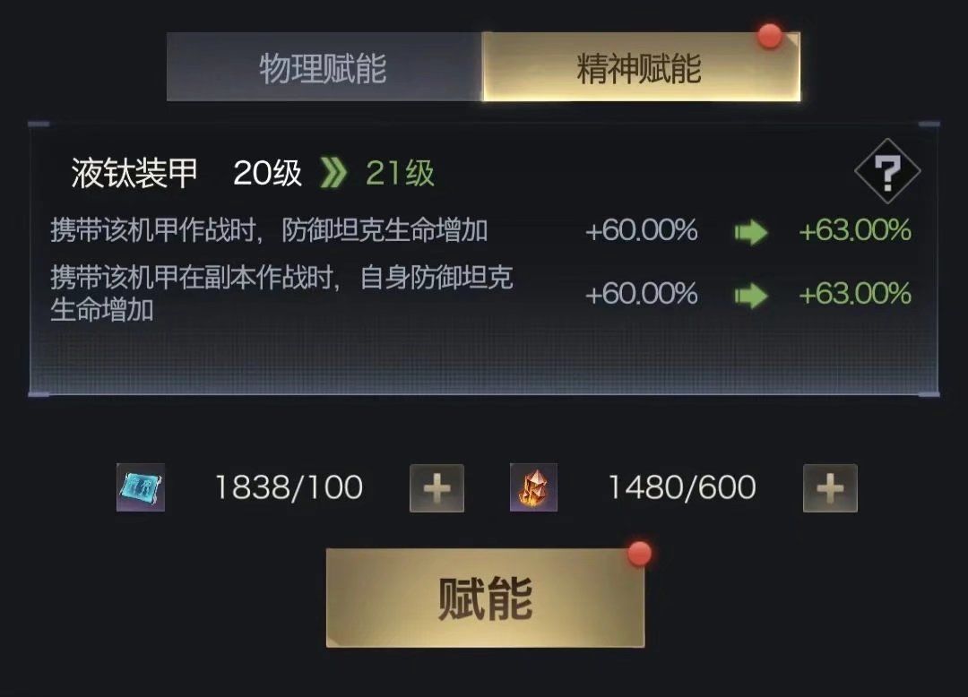 开启精神赋能之后,后续升级需要消耗对应的机甲图纸和赋能结晶,对比物理赋能两种材料的消耗都大大提高了,需要大家根据自己材料情况有侧重的去升级,小编建议大家优先升级自己主玩兵种的机甲,输出兵种优先点攻击、超能攻击;辅助兵种优先点生命。如果想优先升到300级解锁起源外观,也可以先五个部位平均升到30级,之后有针对性的点攻击、生命和超能攻击。