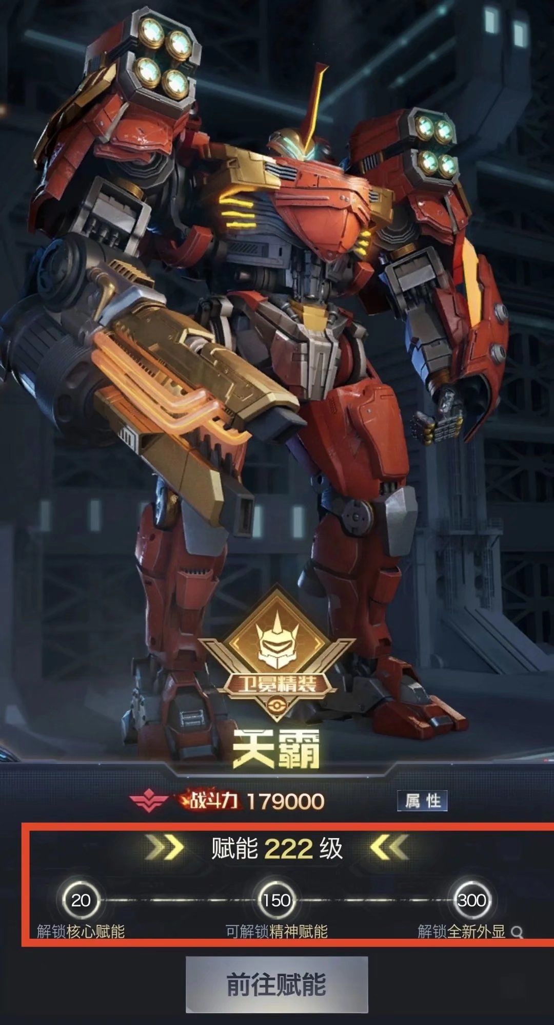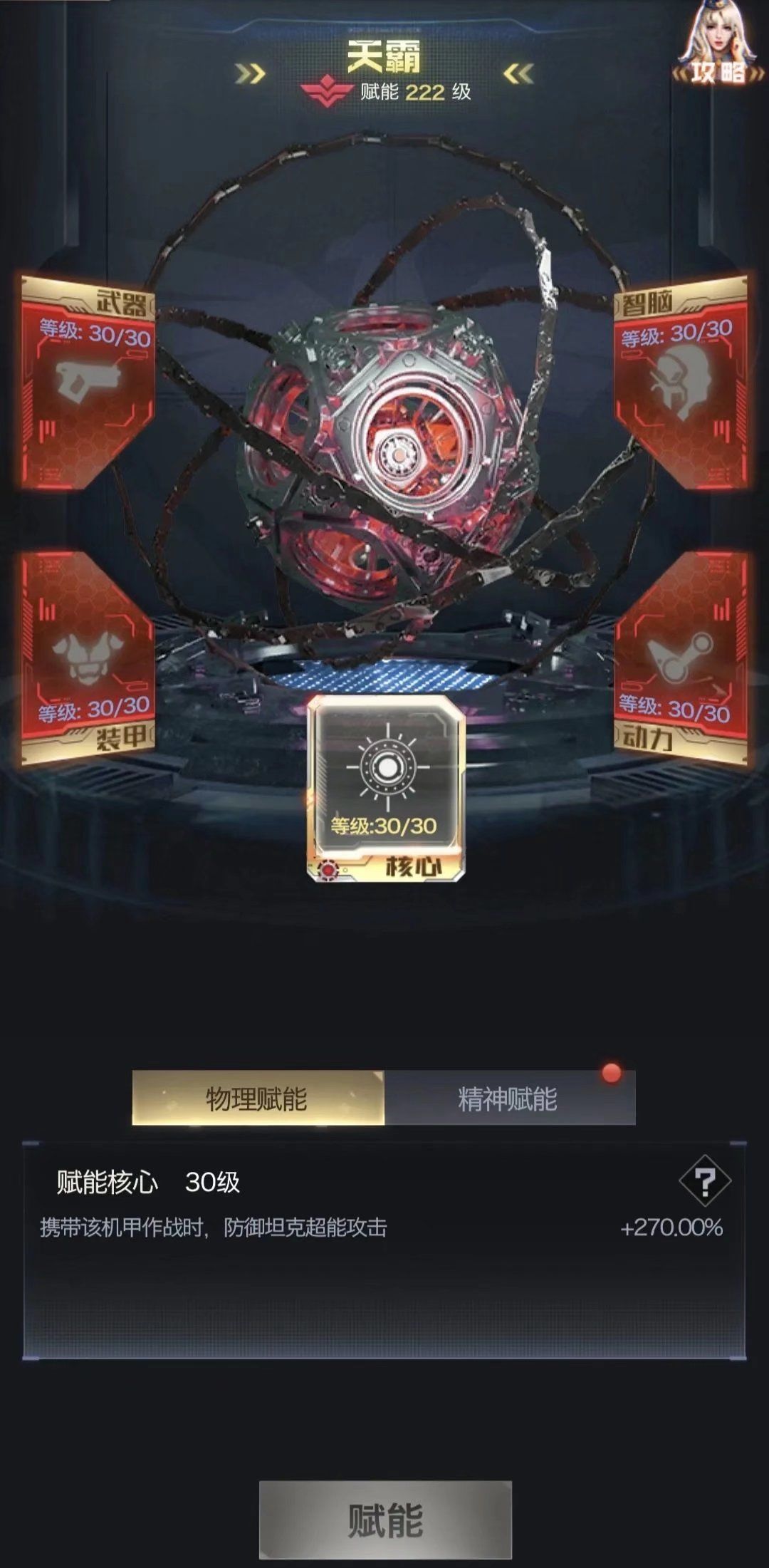 下面以防御坦克机甲天霸为例来给大家介绍一下精神赋能的具体玩法: 解锁精神赋能功能之后,使用机甲图纸和赋能结晶可对机甲五个部位进行赋能,分别是武器、智脑、装甲、动力和核心模块:
