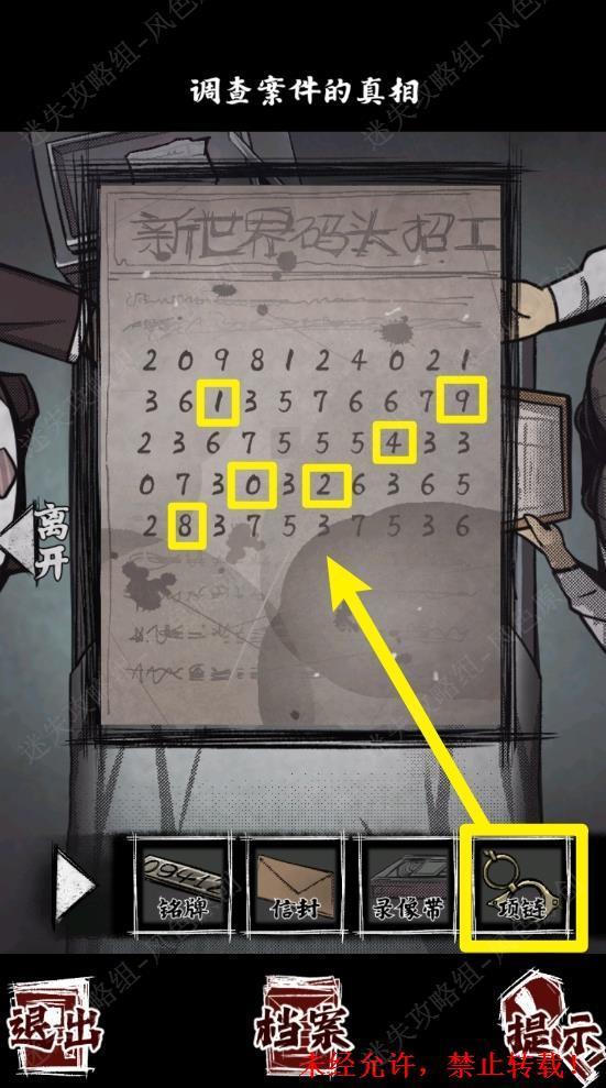 178.点击长按住【项链】,然后拖动到纸上。密码是警号094128,因为【项链】的结构是左上和右下对应的形状,所以需要按照密码的顺序点击图中所示的纸上的094128所在位置(这几个位置上的094128的左上角才有对应的数字)。 178