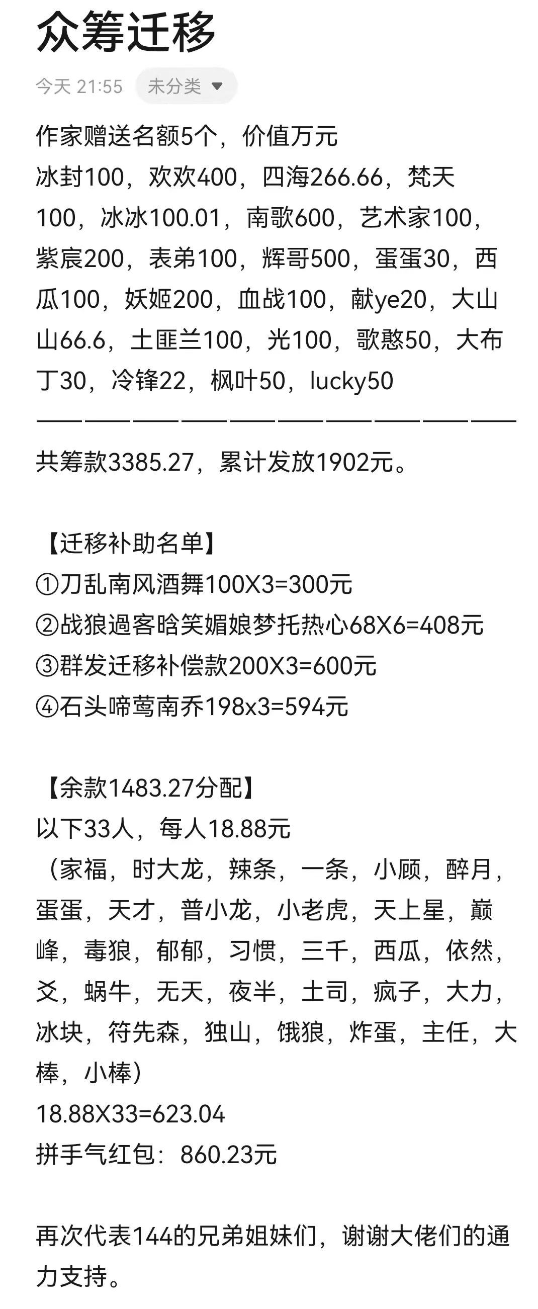 有些人回复他的微信,有的人不回消息。于是楠哥就一遍遍的催办,一遍遍的提醒。 最终,楠哥募捐了3385.27元,有24个盟友捐助红包,有48多个盟友得到补助,所有财物公开、透明,谁出了钱,谁又分了钱。