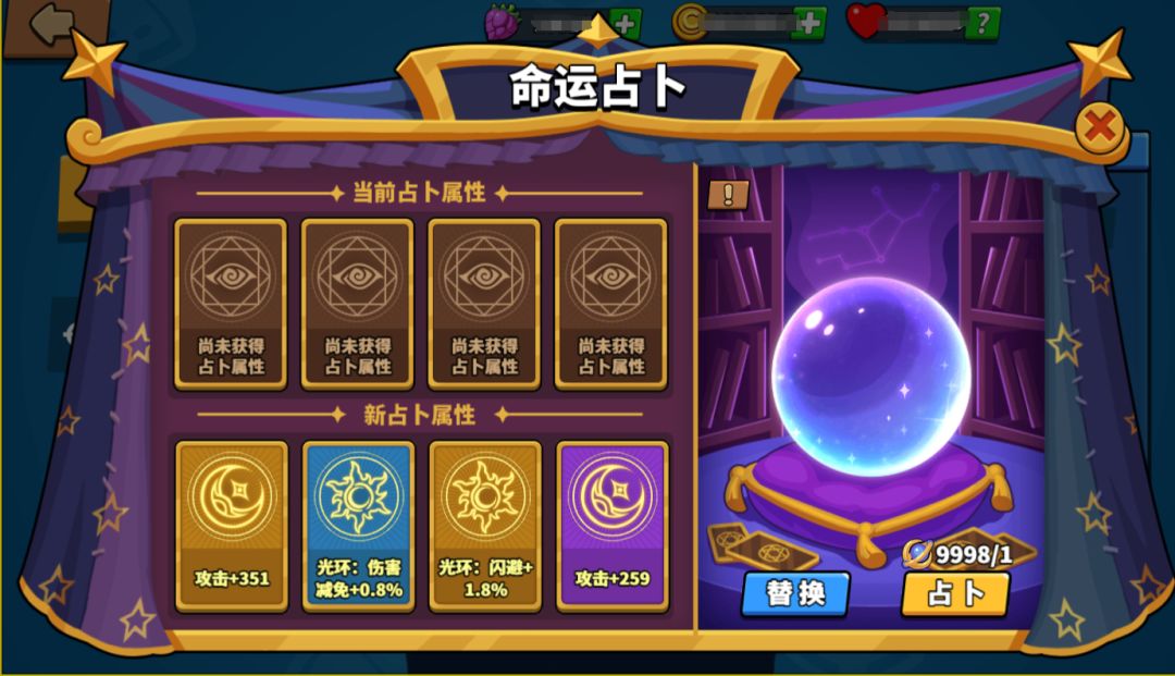 2、消耗占星石可对英雄进行占卜,每次占卜时会获得若干属性词条