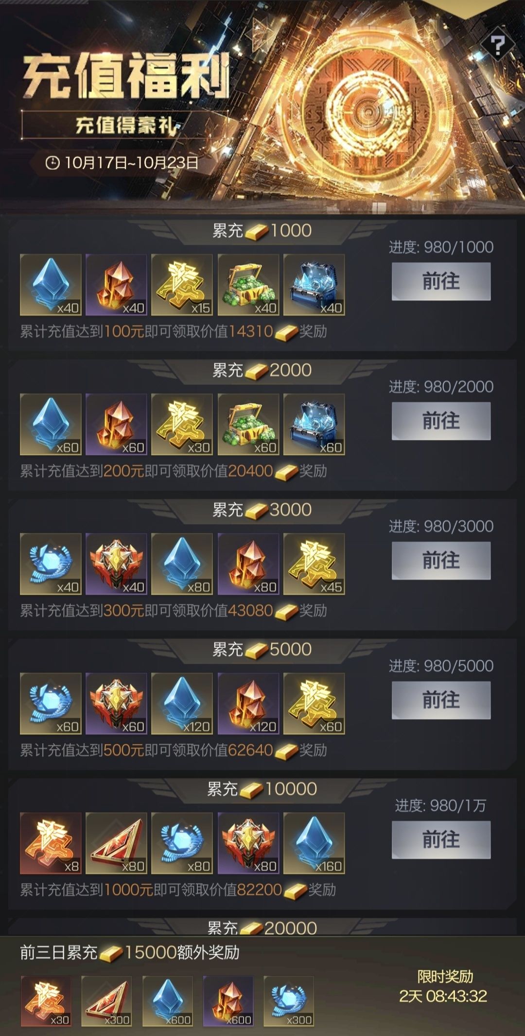 活动期间累计充值达指定金额即可领取对应奖励,五周年的福利力度还是比较大的,除了累充奖励外,前三天累充达到指定额度还有额外的奖励。