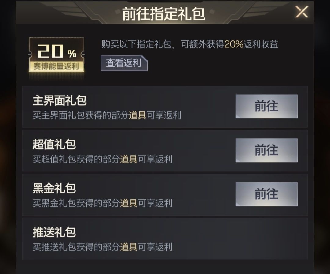 赛博能量返利主要侧重礼包类,比如主页面礼包,超值礼包,特惠商城刷新出的黑金礼包以及做活动激发出的其他推送礼包,礼包的购买就看个人需求了,小编当前建议是购买一些量子扩充石升级神话装备和购买赋能结晶升级机甲精神赋能等级,这两个方向目前提升实力比较大!