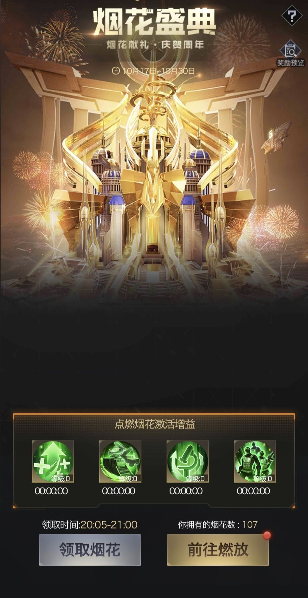活动期间,每天20:05点至21:00可免费领取烟花道具。点燃烟花跳转至世界在您的基地周围燃放烟花,并随机激活1个增益效果,增益效果被激活后将提升等级。点燃烟花后除了激活增益以外同时也会获得相应的奖励哦,燃放烟花庆周年,果断定个闹钟,晚上8点就上去,先把烟花领了!