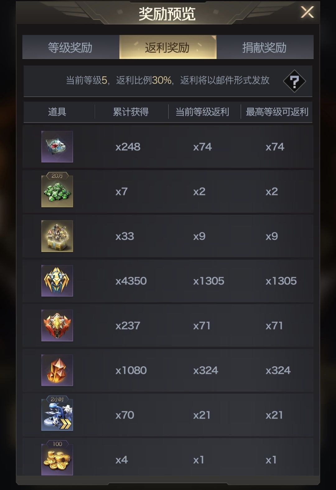 返利道具数量的计算方式为:返还数量=累计获得数量×当前返利比例-已返利数量。本活动返利道具数量向下取整,根据返利比例计算得出的返还道具数量不足1个时不返,大家可以在返利奖励界面查看当前能量等级返利奖励,以及最高能量等级返利奖励。活动结束时,会按当前能量等级返利比例进行最后一次返利结算。以小编联盟为例,已经升到了5级,我参与活动的返利奖励如图所示: