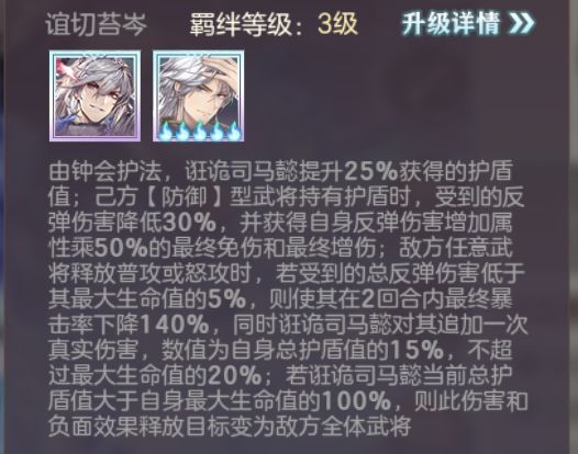 还能极大地降低对方的输出,大大降低其最终暴击率,并且进行反击,和怒攻类似,给予拥有的护盾值造成真实伤害,虽然单次反击伤害不高,但是频率会很高,而到达临界条件后(诳诡司马懿总护盾值大于最大生命值),反击目标更是变为全体,是钟会护法的诳诡司马懿的重要输出手段。